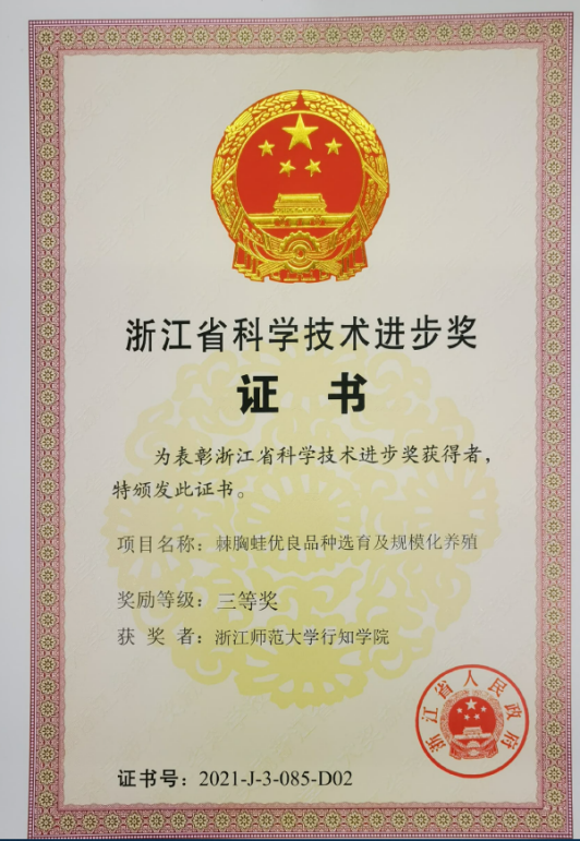 棘胸蛙是我国长江以南山区特有的传统药食两用高经济价值蛙类,是被消费者视为“山珍”的滋补佳品。“棘胸蛙优良品种选育及规模化养殖”项目组经过10多年的科技攻关,在棘胸蛙的遗传多样性及分化、分子标记辅助遗传育种、规模化生态养殖及产品开发利用方面取得了重大突破,推广应用取得了显著成效。为我国棘胸蛙种质资源保护、养殖产业的可持续发展及社会共同富裕作出了重要贡献。项目共获授权国家发明专利13 项,实用新型专利12项,制订浙江省地方标准1项,出版专著1本,发表相关学术论文62篇。项目推广应用于浙江、江西等7省28县,实现新增产值24664万元,利润10871万元;实现间接效益6400万元。生物技术专业教师郑荣泉、胡晓晓为本项目的主要完成人。