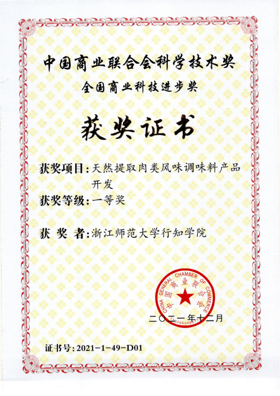 近日,我院作为主持单位申报的“天然提取肉类风味调味料产品开发”项目荣获2021年度中国商业联合会科学技术奖一等奖;浙师大为第一单位,我院作为第二参与单位申报的“棘胸蛙优良品种选育及规模化养殖”项目荣获2021年度浙江省科学技术进步三等奖。