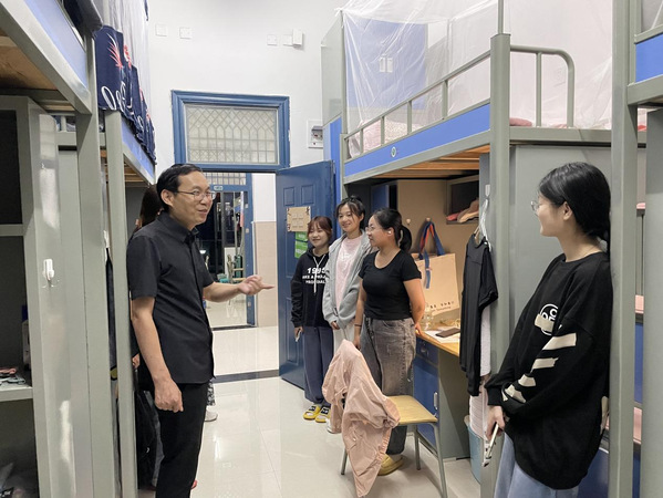 “大学的上课和高中的上课形式不同”“你了解过选修课吗?”“有没有想过加入一些社团和组织?”蒋永华一行在走访新生寝室时询问道。他鼓励新生们专注学业的同时。结合自身的能力与兴趣,积极加入学生组织、参与社团活动,拥有一个丰富多彩,健康向上的大学生活。同时他号召同学们相互关心,互帮互助,打造和谐友善、各具特色的优秀寝室。