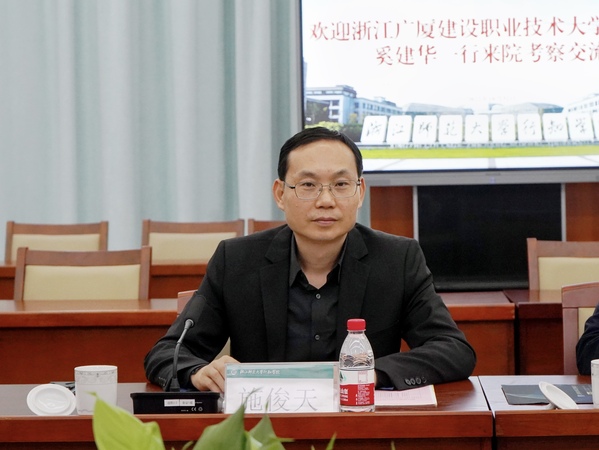 施俊天对浙江广厦建设职业技术大学领导一行的到来表示欢迎。他认为新校区建设首要的是谋划好功能布局,充分考虑功能性和学科特点,满足教学和办公的使用需要;其次是要引入特色文化,建筑的色彩、形态、材料等要始终围绕文化这一核心点去建,提升校园文化品味;三是注重生态安全,材料使用、植物绿化配置等要充分考虑长远性和持久性。