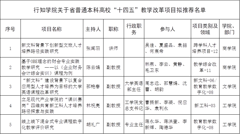 根据《浙江省教育厅办公室关于开展普通本科高校“十四五”教学改革项目建设工作的通知》(浙教办函〔 2022〕297号)等文件的要求,学院组织开展了浙江省普通本科高校“十四五”教学改革项目的申报、评审工作,现将拟推荐名单公示,具体名单如下: