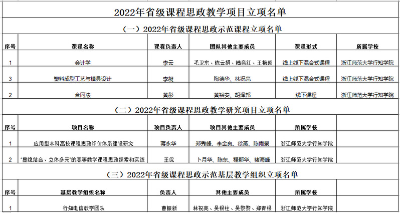 近日,浙江省教育厅公布了2022年省级课程思政教学项目建设立项名单。我院《会计学》等3门课程获省级课程思政示范课程立项,《应用型本科高校课程思政评价体系建设研究》等2个项目获省级课程思政教学研究项目立项,“行知电信教学团队”入选省级课程思政示范基层教学组织立项名单(名单附后)。