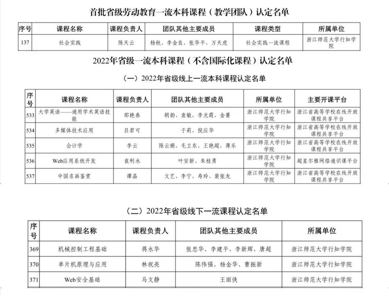近日,浙江省教育厅公布了2022年省级一流本科课程、首批省级劳动教育一流本科课程(教学团队)认定结果。我院申报的29门课程成功入选。其中,我院《社会实践》1门课程被认定为首批省级劳动教育一流本科课程(教学团队),《大学英语——通用学术英语技能》等5门课程被认定为省级线上一流本科课程,《机械控制工程基础》等3门课程被认定为省级线下一流本科课程,《酒店英语》等15门课程被认定为省级线上线下混合式一流课程认定,《思想政治理论课专题实践》等5门课程被认定为省级社会实践一流课程(名单附后)。