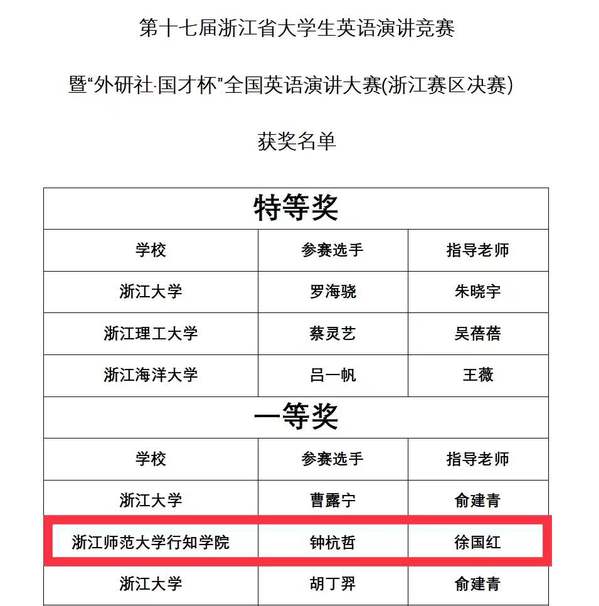 近日,“外研社·国才杯”全国英语演讲大赛第十七届浙江省全国大学生英语演讲竞赛顺利结束,我院学生钟杭哲在徐国红老师的指导下,经过层层选拔角逐,在此次竞赛中荣获一等奖(浙江赛区)。