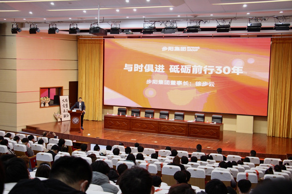 颁奖仪式结束后,徐步云为师生作题为《与时俱进砥砺前行30年》的报告。他从强品牌、强团队、强质量、强服务,步阳文化理念,数字化转型做法以及步阳公益等几方面回顾了步阳集团三十年来的发展历程。最后展望新形势下发展之路,他表示,步阳集团将通过创新驱动,不断向世界一流企业迈进。徐步云寄语行知学子学好专业,相信自己,相信中国,与时俱进,砥砺前行。