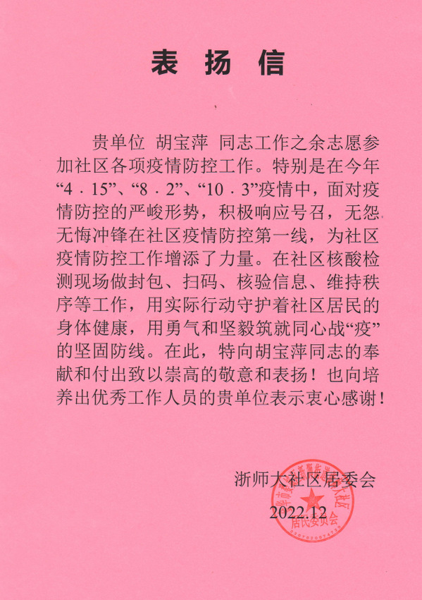 近日,金华市浙师大社区居委会向学院发来表扬信,高度赞扬了新冠疫情期间参与社区疫情防控志愿服务的胡宝萍老师,对其在特殊时期主动担负起疫情防控责任,助力社区抗疫攻坚的辛勤工作表示敬意和表扬。