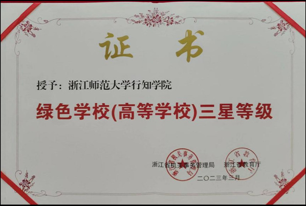 近日,浙江省机关事务管理局、浙江省教育厅公布了第二批绿色学校(高等学校)名单并举办了颁奖仪式,共有62所高校通过评审验收,我院位居前列,荣获“绿色学校(高等学校)三星等级”称号。评价分为三星(优秀)、二星(良好)、一星(合格)三个等级,三星为最高等级。