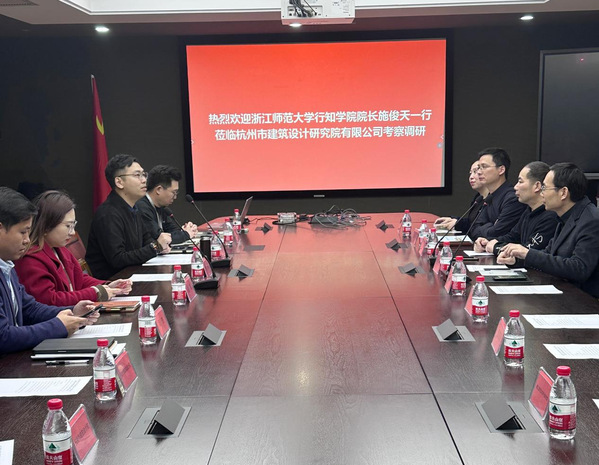 当日下午,施俊天一行到杭州市建筑设计研究院有限公司进行实地考察,该公司文旅中心主任、学院2007级校友黄浩丞对母校领导老师的到来表示热烈欢迎,并陪同参观公司的办公环境、作品展厅。随后双方就如何解决企业“用人荒”和高校“就业难”,如何将企业用人标准、考核要求、技能评估前置至学校课程和实践体系等问题进行了深入探讨。
