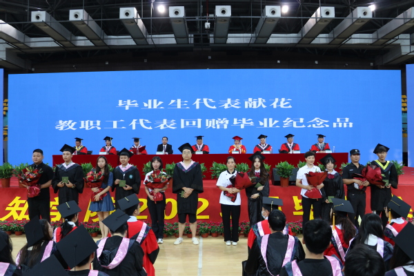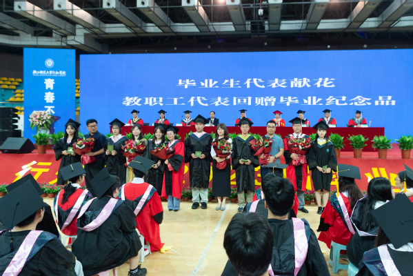 毕业生代表为教师代表、毕业班班主任代表、毕业班辅导员代表、后勤员工代表献上鲜花。同时,教职工代表回赠毕业纪念品并合影留念。