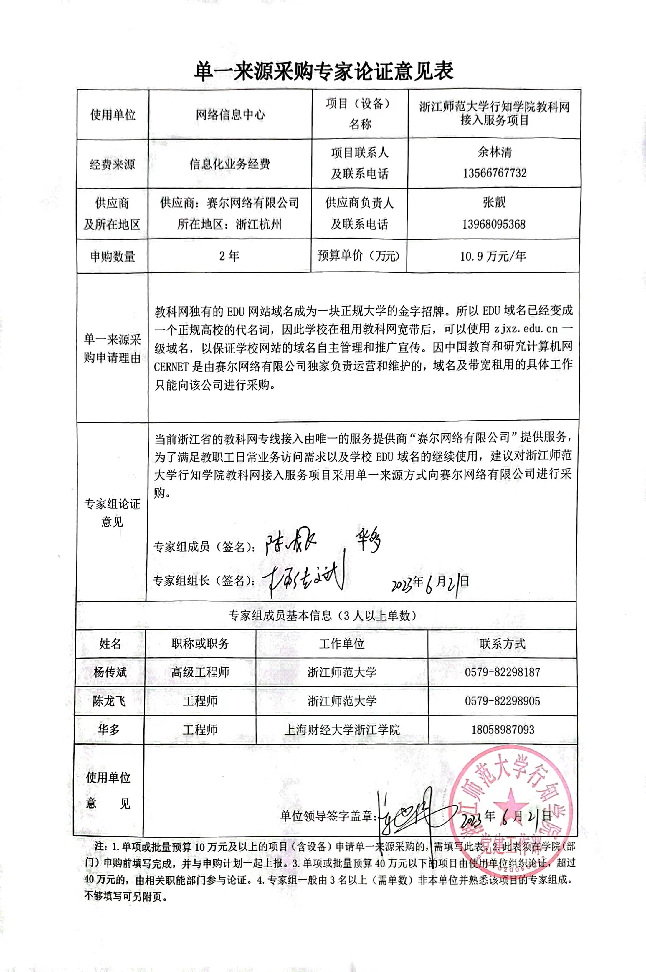 采用单一来源采购方式的原因及说明:自2017年9月8日起,学院开始接入教科网,并注册了域名zjxz.edu.cn,目前域名及网站都正常上线运行。当前浙江省的教科网专线接入由唯一的服务提供商“赛尔网络有限公司”提供服务,上期合同将于2023年9月19日到期。为了满足教职工日常业务访问需求以及学校EDU域名的继续使用,教科网接入业务及域名只能向该公司进行采购。