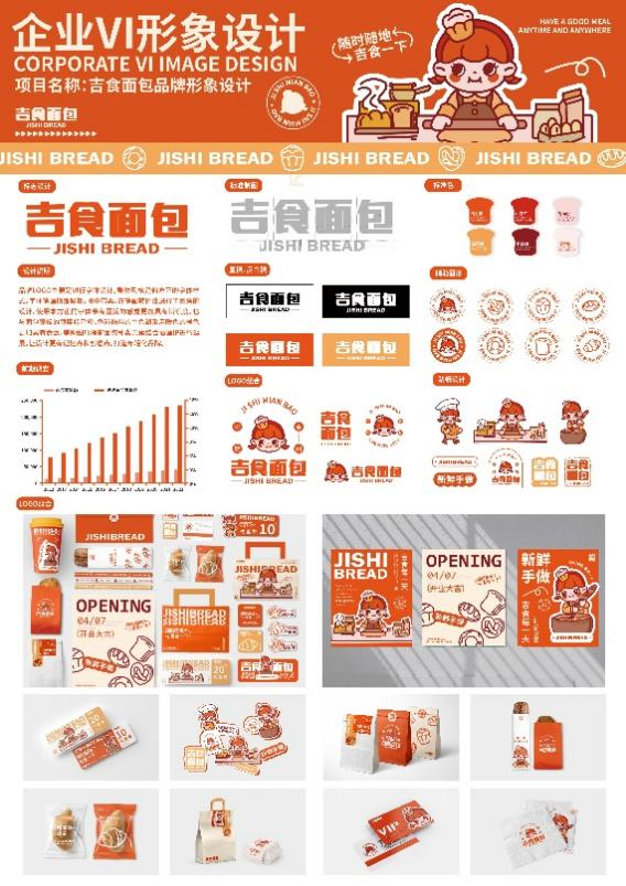 设计理念:品牌LOGO主要是进行字体设计,整体风格是偏方正的字体样式,字体笔画横细竖粗,刚中带柔,在笔画转折处进行了圆角的设计,使原本方正的字体带有圆润的感觉更加具有辨识度,也与面包蓬松的弧度相呼应。色彩物料的主色调采用暖色的橙色更加具有食欲,辅助图形提前面包种类元素结合插画IP进行延展,让设计更有记忆点和创意点,打造年轻化品牌。