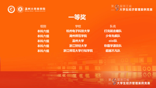 本次大赛(普通赛道)共有来自全省74所高校的502支队伍报名参赛,其中本科院校409支队伍,高职高专93支队伍。经过案例文本双向匿名网评和线下决赛答辩,我院由张琪、王一杰、卢志豪、赵启正、张林娜五位同学组成的“超越不凡队”通过企业调研、案例撰写、文本评选等闯入决赛,与来自杭州电子科技大学、浙江工商大学、浙江财经大学、温州大学等代表队同台竞技,最终斩获省赛一等奖,苏环老师获评优秀指导教师奖。