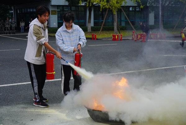 最后,专兼职消防队向学生们演示了灭火器的正确使用方法,随后师生们进行灭火实操比赛,做到理论与实践相结合。