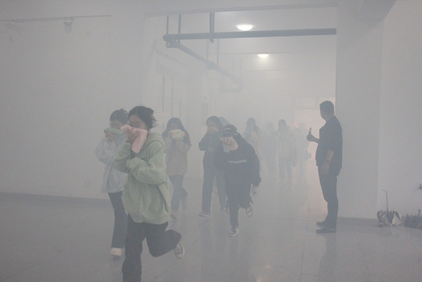 消防疏散演练队伍集合完毕,总指挥发出指令,演练正式开始。教学楼内,上课期间因线路短路引发火灾,浓烟弥漫。现场人员第一时间按响附近消火栓报警按钮,启动应急疏散预案,向校内及微型消防站和校外报警疏散引导利用扩音器向全体师生员工下达立即疏散的指令学生们用湿毛巾捂住口鼻,弯腰前行,迅速、有序地从楼梯右侧撤离,并在疏散人员的引领下于教学楼外指定的空地集合,并迅速清点人员。