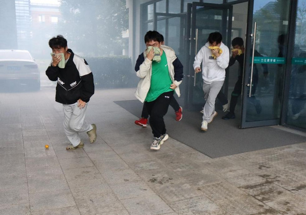 紧张演练氛围下,学生们时刻保持着井然的秩序。各学院负责人确定全员安全撤离完毕后,师生们有序转移到图文广场。