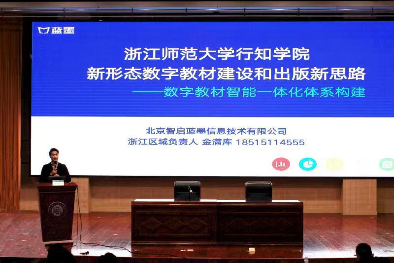 北京智启蓝墨信息技术有限公司浙江区域负责人金满库作为主讲嘉宾进行了分享。他从政策解读,数字教材介绍与演示,数字教材策划、创作、建设与应用思路,数字教材制作技巧、申报奖项与优秀案例等方面进行深入解读。他表示,随着人工智能技术的不断发展,教材的建设已经从传统的纸质教材向数字化、智能化方向转型,而数字教材智能一体化体系构建则是实现这一转型的关键。