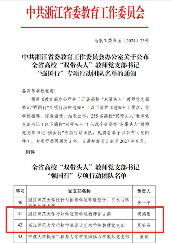 近日,中共浙江省委教育工作委员会办公室公布全省高校“双带头人”教师党支部书记“强国行”专项行动团队名单我院理学院教师党支部设计艺术学院教师党支部2个支部成功入选。