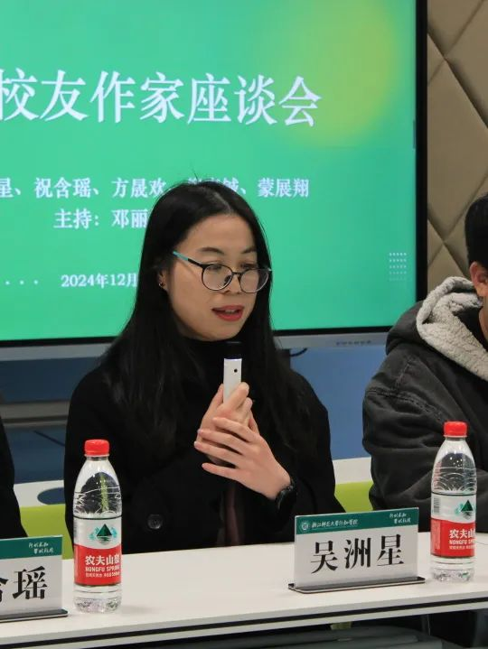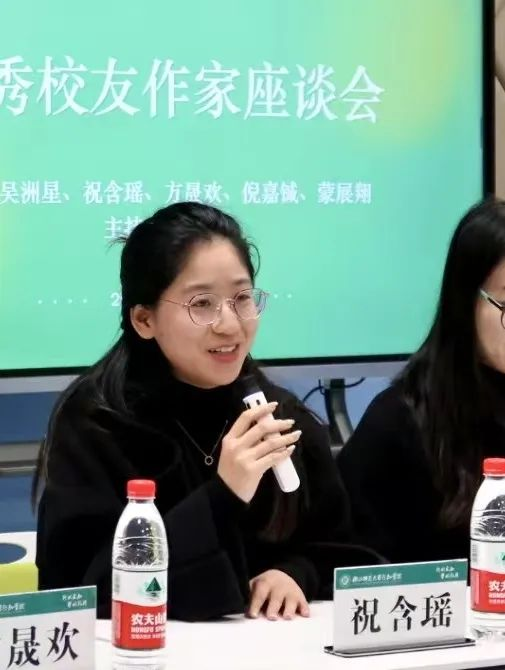 此前,学院还专门组织了优秀校友作家“主题沙龙”,吴洲星、祝含瑶、方晟欢、倪嘉铖、蒙展翔等五位优秀校友参加。
