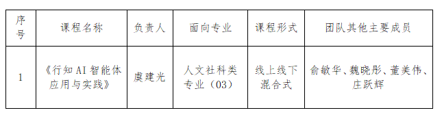 根据《浙江省教育厅办公室关于开展省级一流人工智能本科课程建设暨2025年省级一流人工智能通识课程申报工作的通知》(浙教办函〔2025〕10号)文件要求,学院于近期组织开展了2025年省级一流人工智能通识课程推荐申报工作。经教师申请、各教学单位推荐、专家评审,拟推荐《行知AI智能体应用与实践》申报省级一流人工智能通识课程遴选类,现予以公示。具体信息如下: