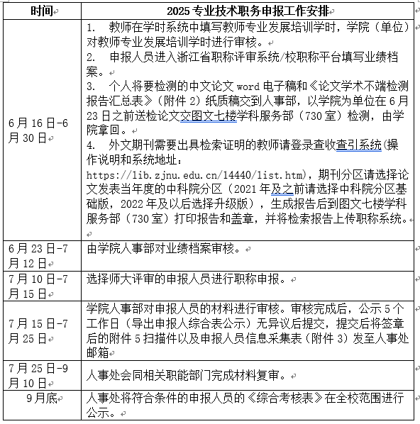2025年度专业技术职务评聘工作将于近日正式启动,根据省人力社保厅要求,我校专业技术职务评聘工作依托浙江省专业技术职务任职资格申报与评审管理服务平台(以下简称“系统”)开展,实行系统申报、系统审核、系统评审。本年度申报人员可参考《开云kaiyun官方网站关于专业技术职务申报条件的若干意见(修订)》(浙师人字〔2021〕30号)和开云kaiyun官方网站关于印发专业技术职务评聘工作实施方案(修订)的通知(浙师人字〔2023〕14号)(详见附件1),进入职称评审系统填报信息并提交相应佐证材料。现将填报和审核工作有关事项通知如下: