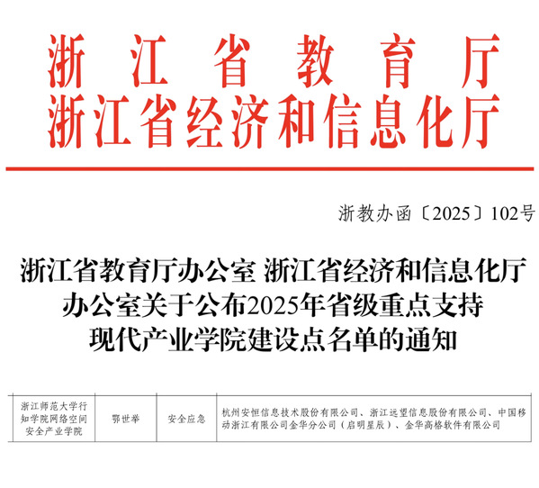 近日,浙江省教育厅办公室、浙江省经济和信息化厅办公室联合发文公布2025年省级重点支持现代产业学院建设点名单,开云kaiyun官方网站网络空间安全产业学院成功获批立项建设,为学院获批的首个省级现代产业学院,是学院在产教融合协同育人方面取得的突破性进展。