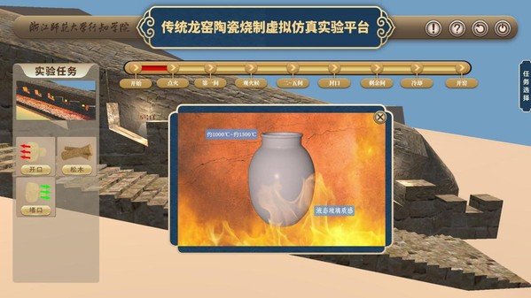 该课程依托虚拟仿真技术,突破传统陶瓷工艺教学中的时空限制,系统还原了龙泉青瓷龙窑烧制工艺中的建窑、装窑、烧成、冷却等核心工艺流程。课程团队历时三年研发,构建了“理论学习→虚拟实训→成果评估”的教学闭环,有效解决了传统工艺实操风险高、耗材成本大、工艺稳定性差等教学难题。实现学生对传统龙窑陶瓷烧制全过程的自主式操作、探究式分析、沉浸式学习,进而有效地提升学生的认知水平和创新能力。课程聚焦文化传承与科技融合,通过虚拟仿真技术,完成了对龙泉青瓷龙窑烧制技艺的数字化解构与教学转化,不仅实现了非遗技艺的系统性传承保护,更打造了国内同类院校领先的非遗数字化教学范式,开辟了应用型高校“非遗活态传承”的特色育人赛道。