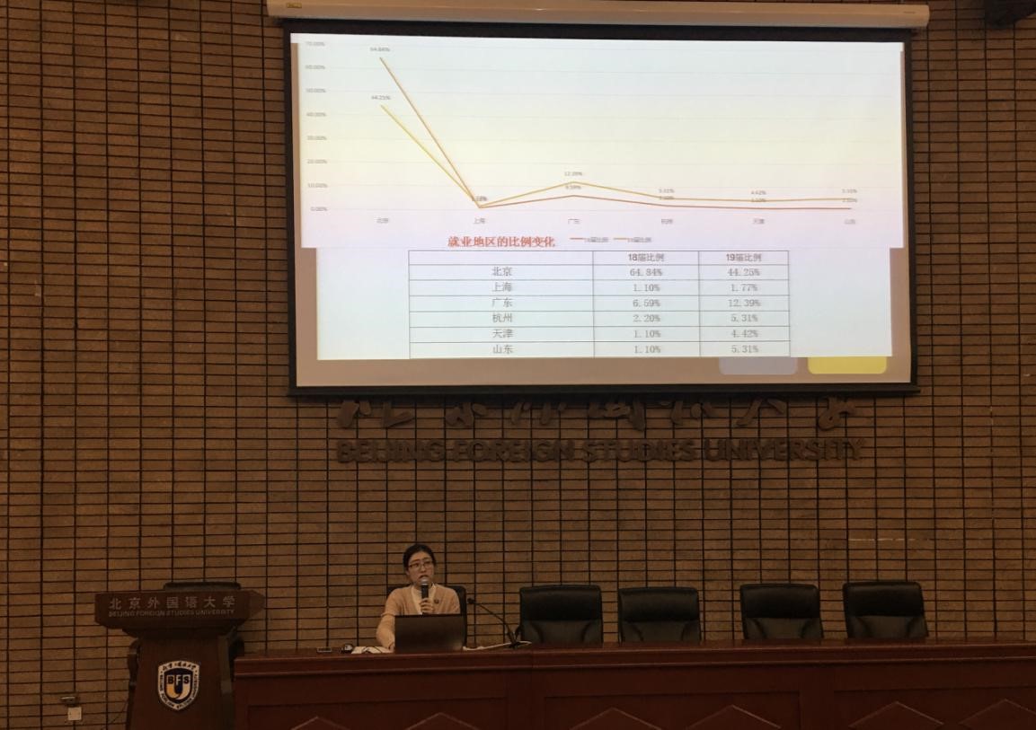 刘厚广分析指出,新时代对大学生就业提出了新要求,要努力提高思想政治素质、政策理论水平、道德品行修养和专业基础能力,适应国家治理体系和治理能力现代化进程对高水平人才的要求。要加深对北外中文专业毕业生就业能力认知,在综合素质和比较优势前提下树立就业自信。既要立足教育主流行业,又要拓展就业视野,把目光投向各行各业中。在就业地区方面,随着地域性人才引进政策的提升,同学们应把握机会,进行广泛的岗位选择。