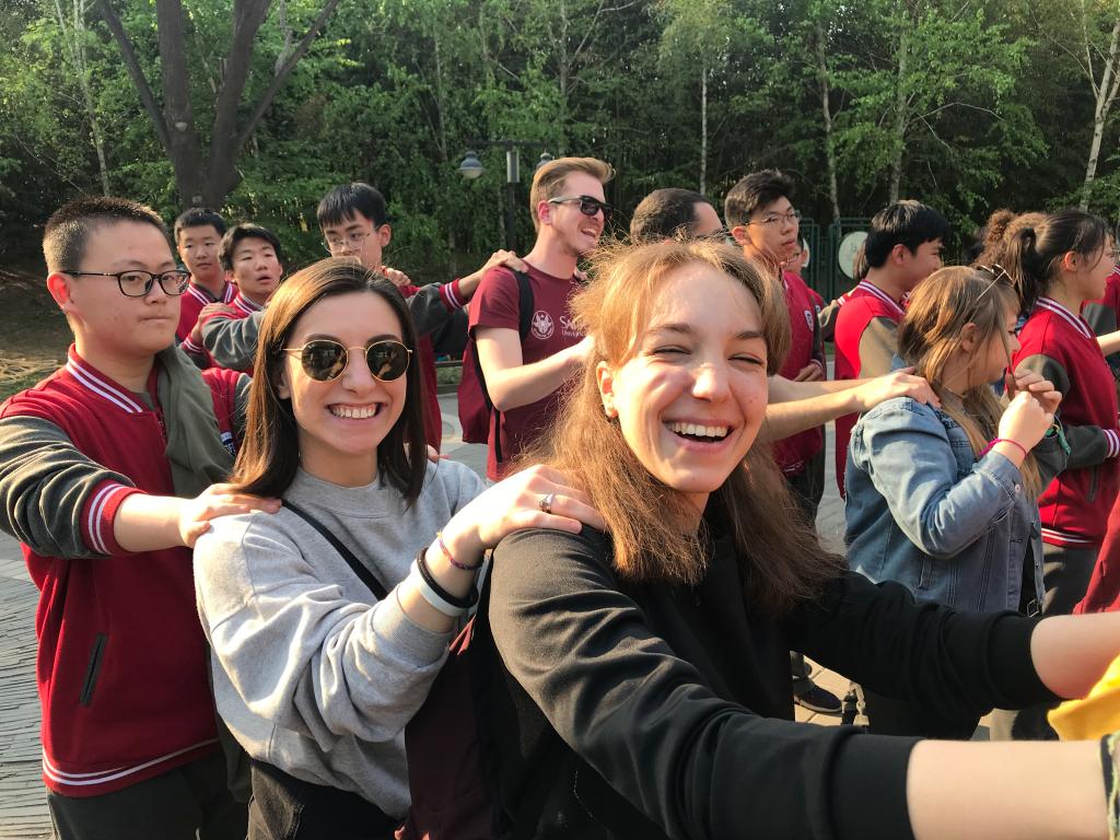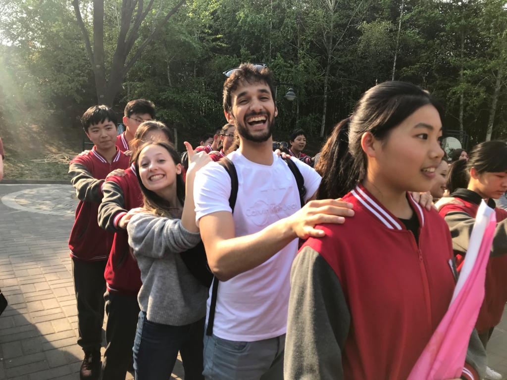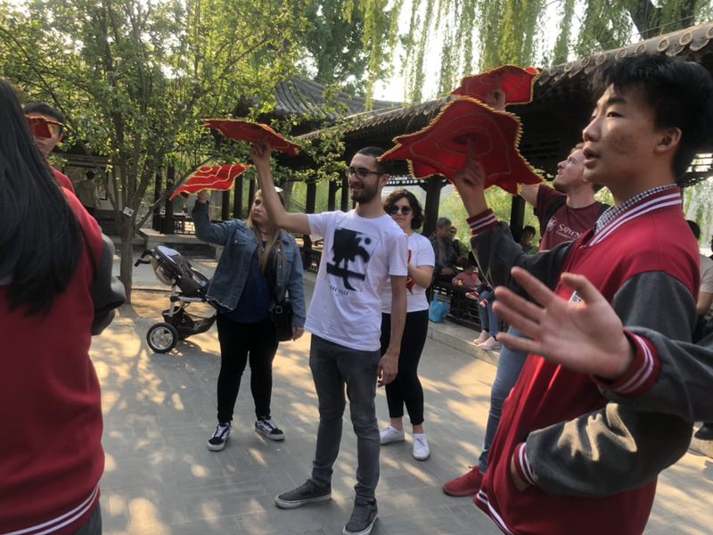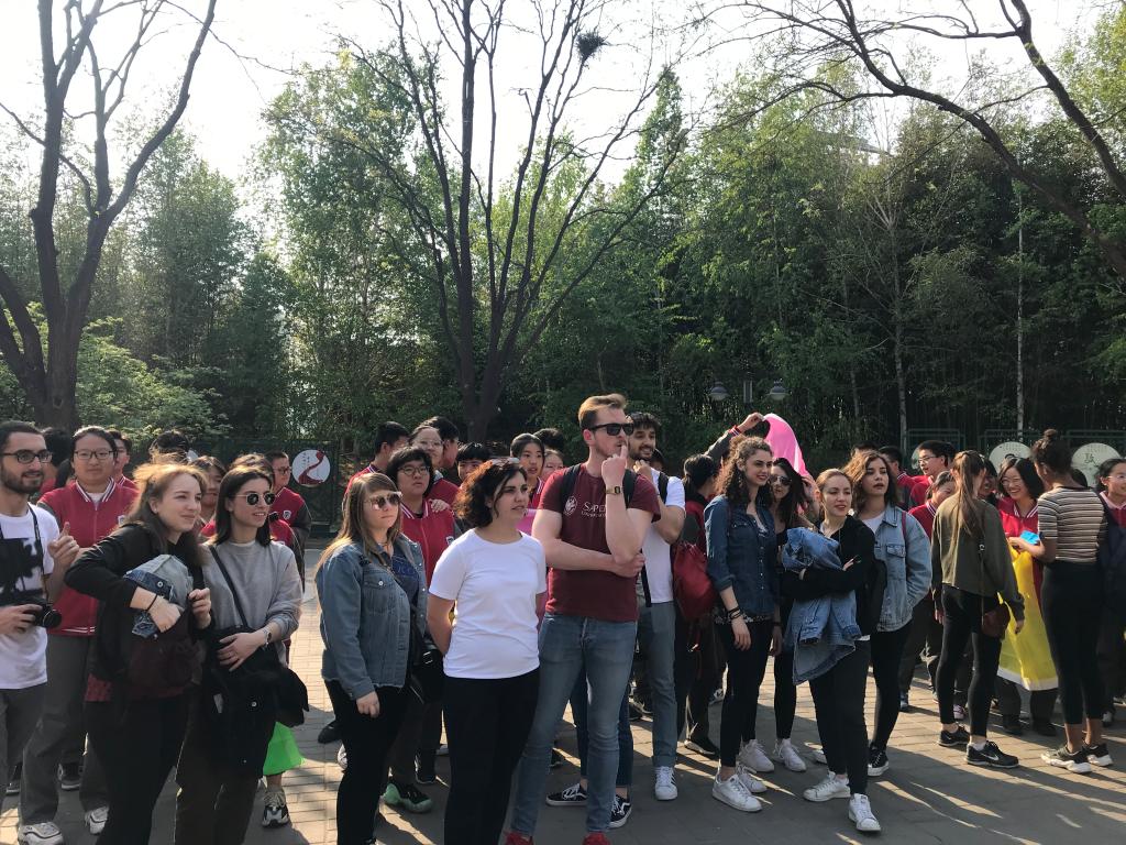 2019年4月15日星期一下午,MILE米乐官方网站中文学院对外汉语系2018级意大利罗马班的全体留学生与北外附中初三、高一年级学生共同参加了在紫竹院公园举办的“青春飞扬,舞动春日” “1+3”年级趣味运动会。