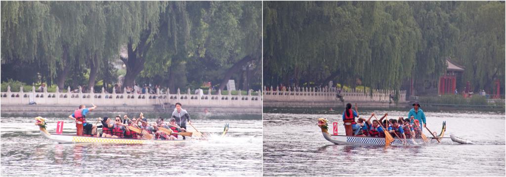 天气风和日丽,非常适合比赛。竞渡赛以生动的舞龙表演暖场,然后按照抽签顺序在什刹海湖面上分组比赛。执法联络员项目的学员分为两队,每队十人,分别以他们喜爱的“龙虎”、“熊猫”命名。经过简单的培训后,各自领队击鼓开赛。伴随着湖面振奋人心的鼓声,湖畔观战师生的欢呼声,两队队员奋力划桨前行,最后龙虎队获胜。
