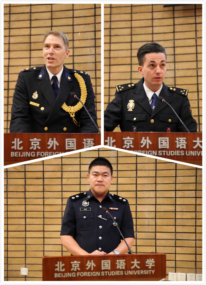最后三位班长各自代表本班致辞。作为零起点学生,西班牙警官卡洛斯全程用中文风趣、幽默地为大家讲述了学员们一年的学习与生活。荷兰警官童铁马的发言高度概括了学员们一年来的感受与体会,认为这一年的经历意义非凡、终生难忘。最后,赵劲雄以流利标准的汉语,展示了高级班学生在系统的警务汉语学习后所取得的成果。他希望能用所学构筑起中国与马来西亚警务沟通的桥梁。