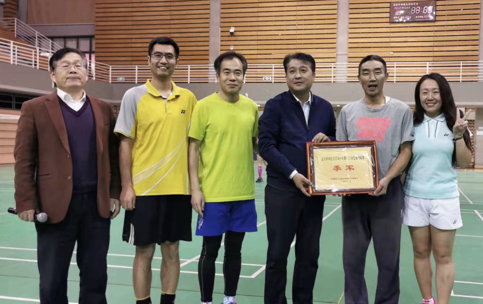 本次团体赛为淘汰制,包括男双、女双、混双三个项目,采用三局二胜制。经过为期四天紧张激烈的角逐,中文学院教工羽毛球队先后战胜日研中心、网络继续教育学院,挺进四强。在半决赛中遭遇实力强大的卫冕冠军外研社,在女双不敌对手的情况下,男双前两局战成1:1,第三局以两分之差惜败。三四名排位赛中对阵上届比赛的亚军科技园,最终以2:1战胜对手斩获季军。