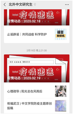 防疫抗疫专题推送弘扬主旋律。2020年1月底开始,本科和研究生团学组织联合推出持续一个月的防疫抗疫专题,帮助学生们对新冠病毒形成理性客观的认识。设置的“疫情进展”“防疫课堂”“止谣辟谣”“心理疏导”“最新政策”五个专栏,为同学们普及新冠病毒防疫知识,解读政府防控政策,疏解宅家心理,发挥了积极正面的导向作用。