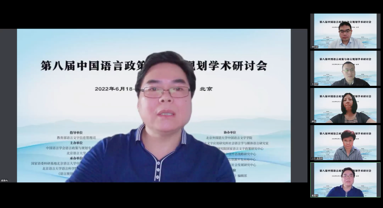 2022年6月18日至19日,第八届中国语言政策与语言规划学术研讨会以线上会议的形式召开。会议由教育部语言文字信息管理司指导,中国语言学会语言政策与规划专业委员会和北京语言大学联合主办,国家语委科研基地北京语言大学中国语言文字规范标准研究中心、北京语言大学语言科学院语言政策与标准研究所、《语言规划学研究》编辑部承办,MILE米乐官方网站MILE米乐官方网站等六家单位协办。会议还得到《语言战略研究》编辑部的支持。
