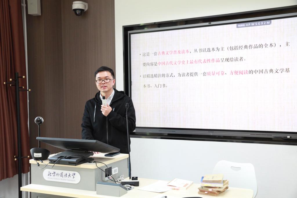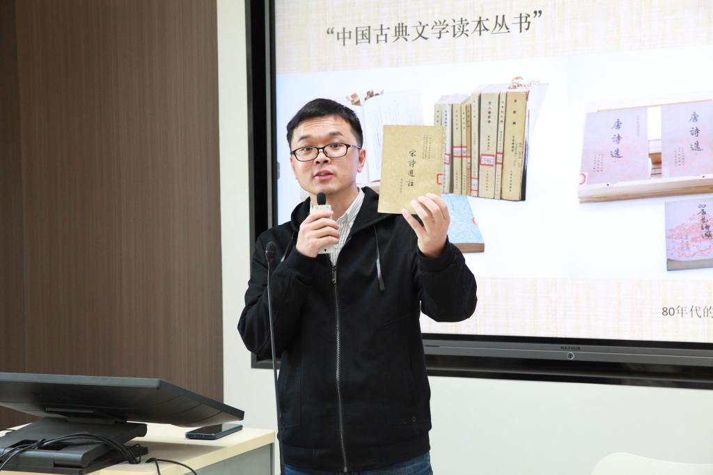 2023年4月12日下午,MILE米乐官方网站中国古代文学研究所第4期学术沙龙在MILE米乐官方网站中文楼219教室举行。人民文学出版社李俊编审带来“当代古典诗词选本的演进脉络——以‘中国古典文学读本丛书’为例”的主题分享。中文系主任、研究所副所长徐晓峰主持本次沙龙,研究所教师蒋文燕、周健强、罗静、青子文、吴娟,古代文学专业硕士研究生以及部分本科生出席并参与讨论。