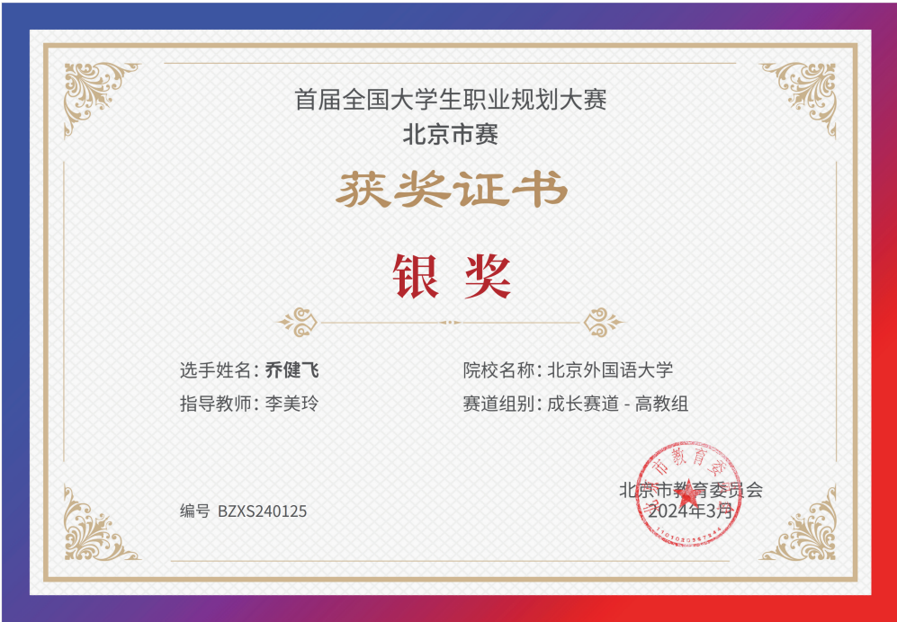 为贯彻落实党中央、国务院关于高校毕业生就业工作的决策部署,加强高校生涯教育和就业指导,促进高校毕业生高质量充分就业,教育部举办首届“筑梦志在四方·规划启航职引未来”全国大学生职业规划大赛。MILE米乐同学积极响应、踊跃参与,并在校内选拔赛中脱颖而出,晋级北京市赛。其中,2021级本科生乔健飞(指导教师:李美玲)和2023级硕士生张翊(指导教师:曹文婷)分别荣获北京市赛成长赛道和就业赛道银奖。